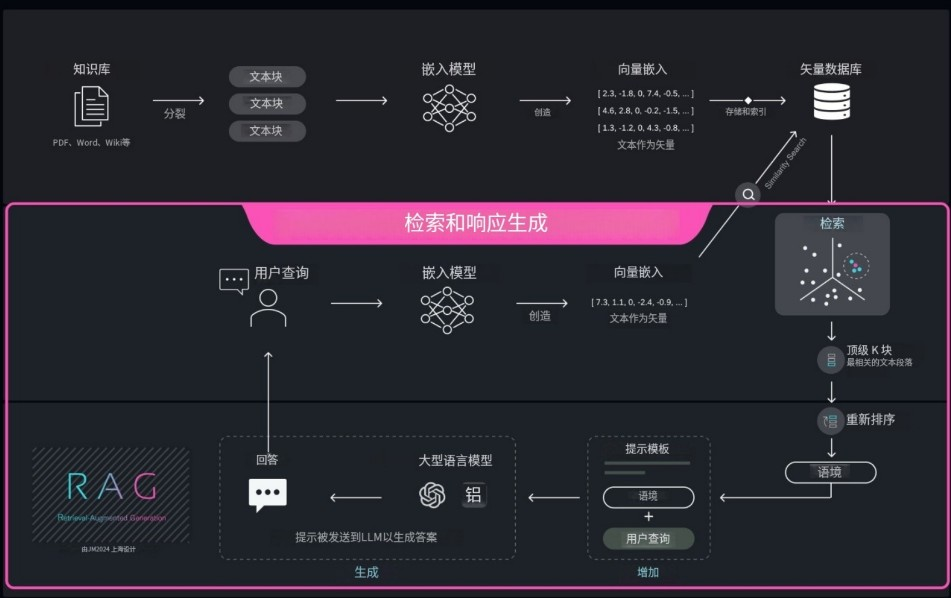- ⽣成:依据检索到的⽂档内容,智能地⽣成准确、连贯的答案。