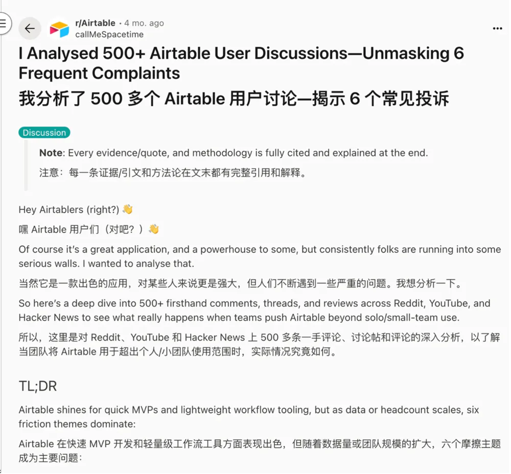 - 老用户的不满:在 Reddit、YouTube 等社区,大量长期 “超级用户” 吐槽 AI 功能是 “无用噱头”。他们反馈,AI 生成的数据库 “逻辑混乱”,若不手动清理会留下 “数月技术债务”,反而不如从模板或零开始构建高效;更关键的是,他们长期关注的核心痛点 —— 如 10 万行以上数据处理性能下降、API 速率限制 —— 并未随 AI 转型得到解决,认为公司 “为了追逐 AI 热点,忽视了核心功能优化”。