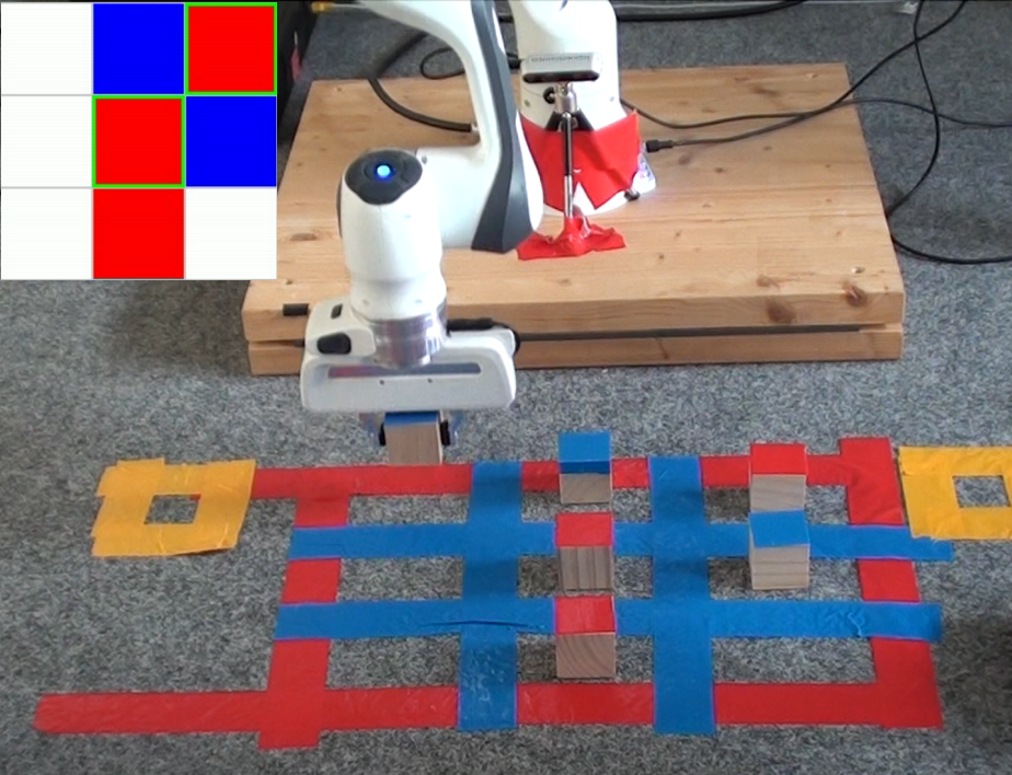 在该实验中,我们在 Franka Emika Panda 机械臂(运行 ROS Jazzy 系统)上实现了简化的网格世界积木操作场景,以验证框架在抽象模型之外的可行性。实验设置如下:机械臂在 3×3 工作空间内操作实体积木(可放置或移除),与示例 1 中描述的状态完全对应。人类通过放置红色积木与工作空间交互,机器人则放置蓝色积木。系统会实时监测积木配置,并评估机器人任务规范(如 “保持积木不相邻”)是否当前满足。