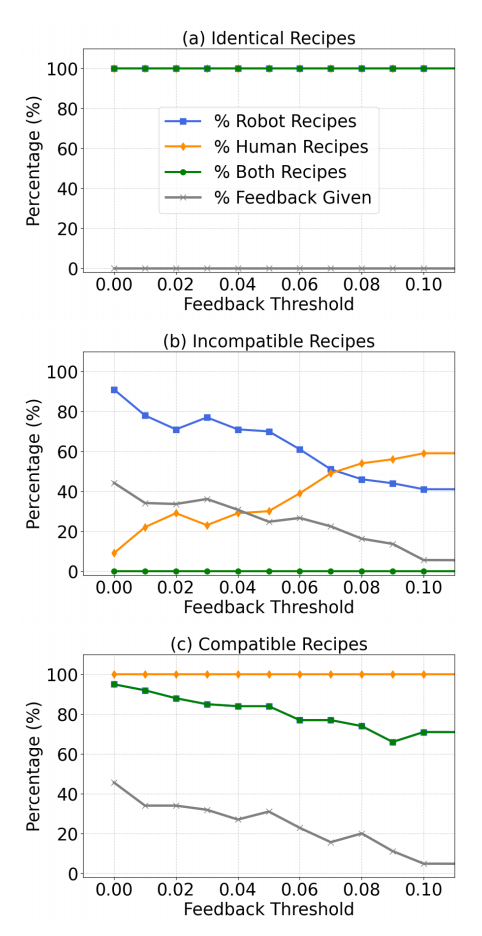 在该场景中,人机食谱不同,但存在同时满足双方的汤品。如图 3(c)所示,所有运行中人类均能持续满足自身食谱,而机器人通过 “策略调整” 和 “反馈” 确保自身食谱也能满足: