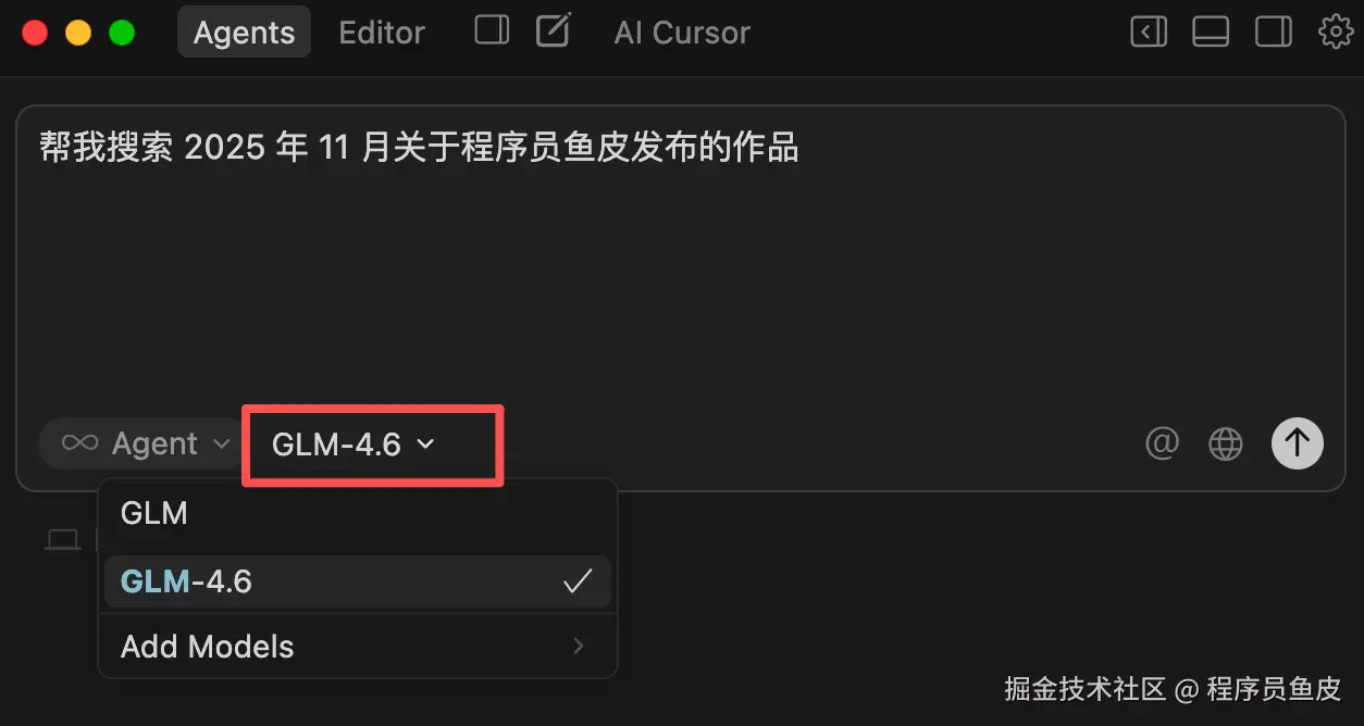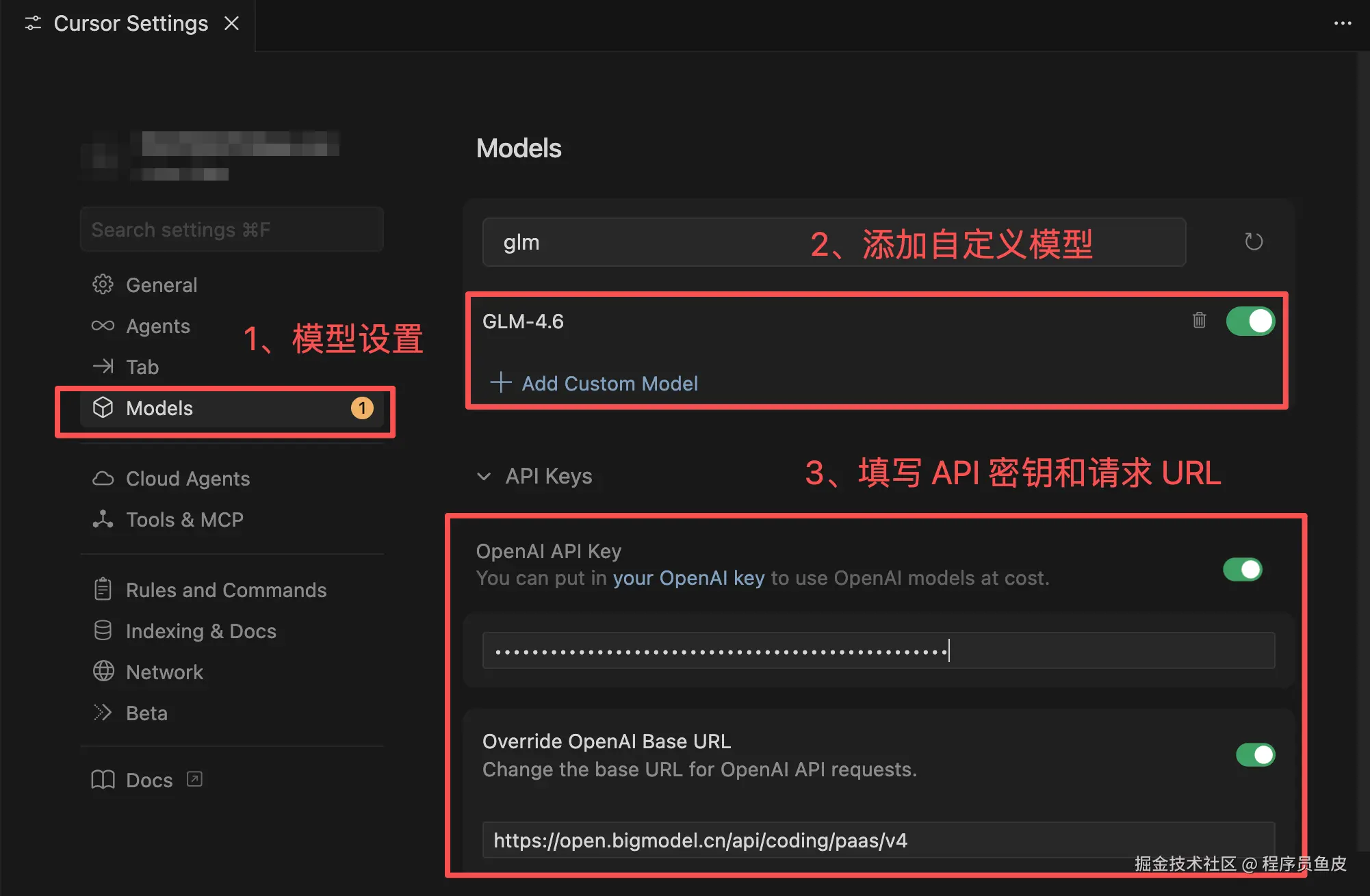 首先打开 Cursor 的设置界面,进入模型设置,然后添加自定义模型,注意名称一定要是大写的 GLM-4.6