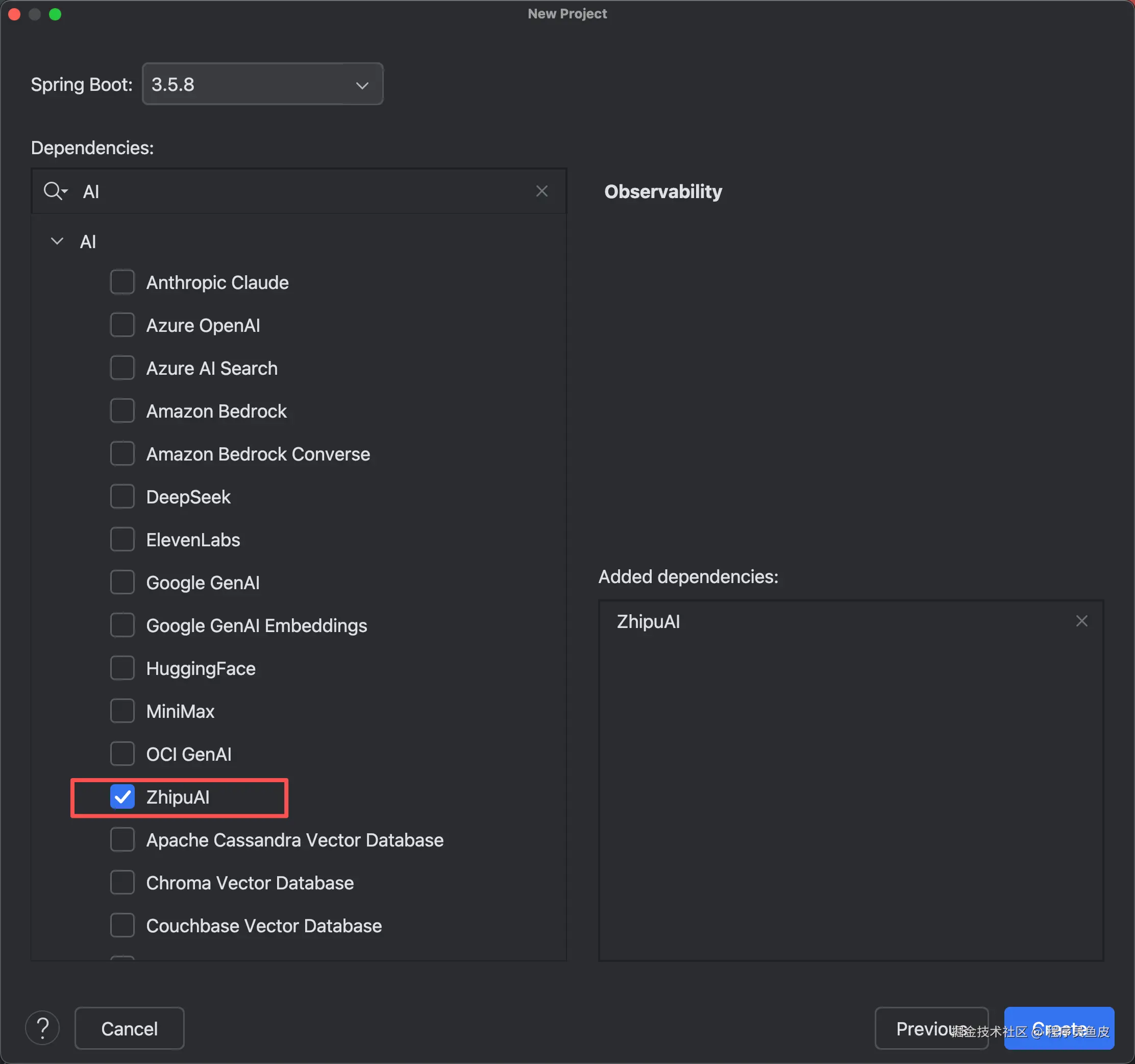 Spring AI 已经兼容了智谱系列的大模型(包括 GLM-4.6),只需要勾选 ZhipuAI 依赖就好: