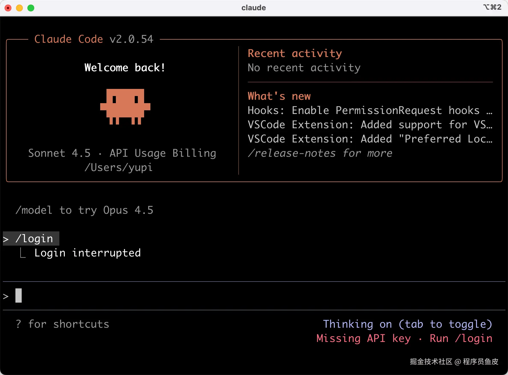 然后执行 claude 命令打开程序,默认是需要登录 Claude 账号的,否则无法使用: