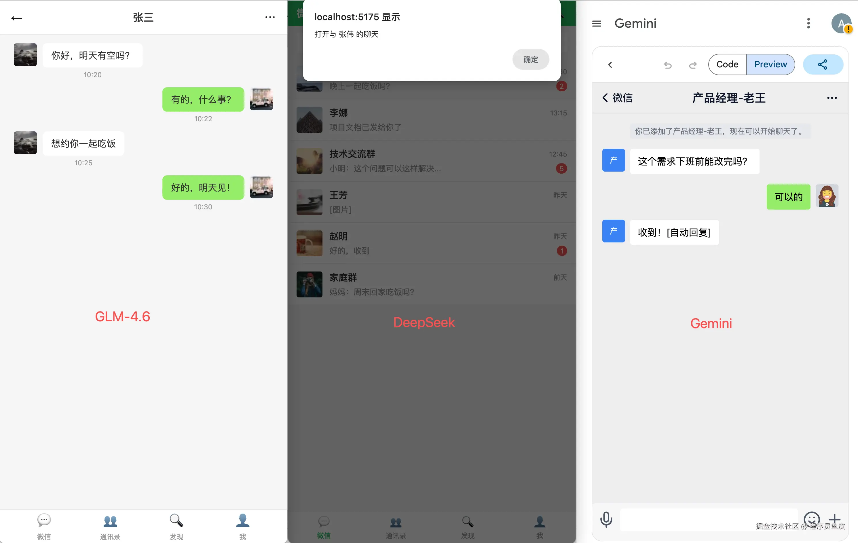 Gemini 3 的还原度是最高的,其次是 GLM-4.6,而 DeepSeek 根本就没有做聊天页面。不过这里我用的是 Gemini 3 的 Canvas 模式,有些图标会自己绘制,而国内的大模型直接用 Emoji 来代替图标了,所以逼真度差了一截。