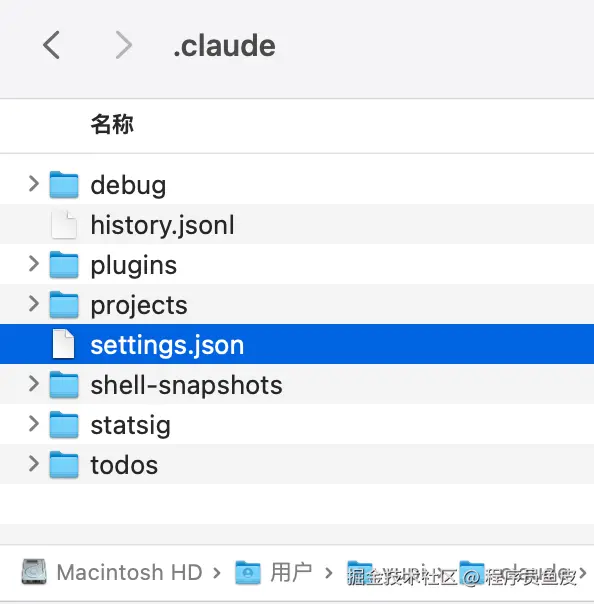 不过没关系,让我们把它背后的 AI 大模型换成国内的。首先进入 {用户目录}/.claude 目录,创建一个 settings.json 配置文件: