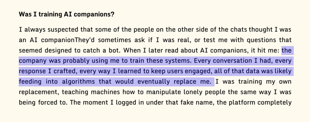这家公司很可能一直在利用我来训练这些系统。每一次对话,我写下的每一个回复,我学会的每一种让用户持续投入的方式,这些数据大概率都在喂给算法,而这些算法最终会取代我。