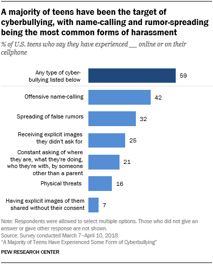 孩子们不仅在网上看视频,他们还在网上「肉搏」。根据皮尤研究中心(Pew Research Center)和多项针对青少年网络行为的数据显示,近一半(46%)的青少年曾经历过网络霸凌或骚扰。