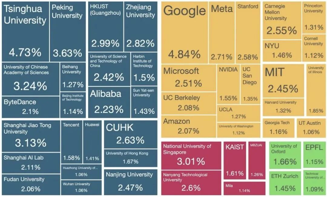 清华、北大、上交大、浙大等高校在顶级会议上的统治力,是美国高校(即使是斯坦福和伯克利)所难以匹敌的。