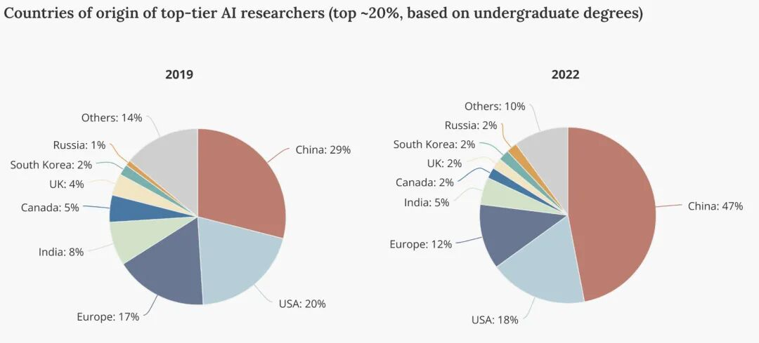 根据MarcoPolo的数据,2022年,中国在全球AI人才产出上已经占据了绝对优势,份额高达47%,相比之下,一直被视为AI宇宙中心的美国,其本土产出占比仅为18%。