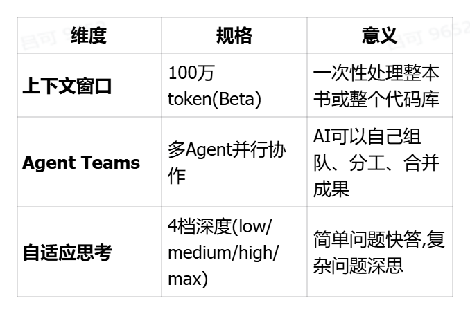 核心升级:100万token上下文窗口(5倍提升)、多Agent并行工作能力、自适应思考深度。定价不变。