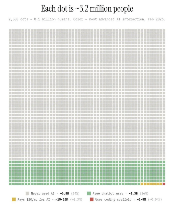 但滩头阵地终究只是滩头。根据Microsoft AI Economy Institute的数据,截至2025年,全球只有0.04%的人试过用AI编程,为AI工具付费的比例也只有0.3%,84%的人甚至从未真正使用过AI。
