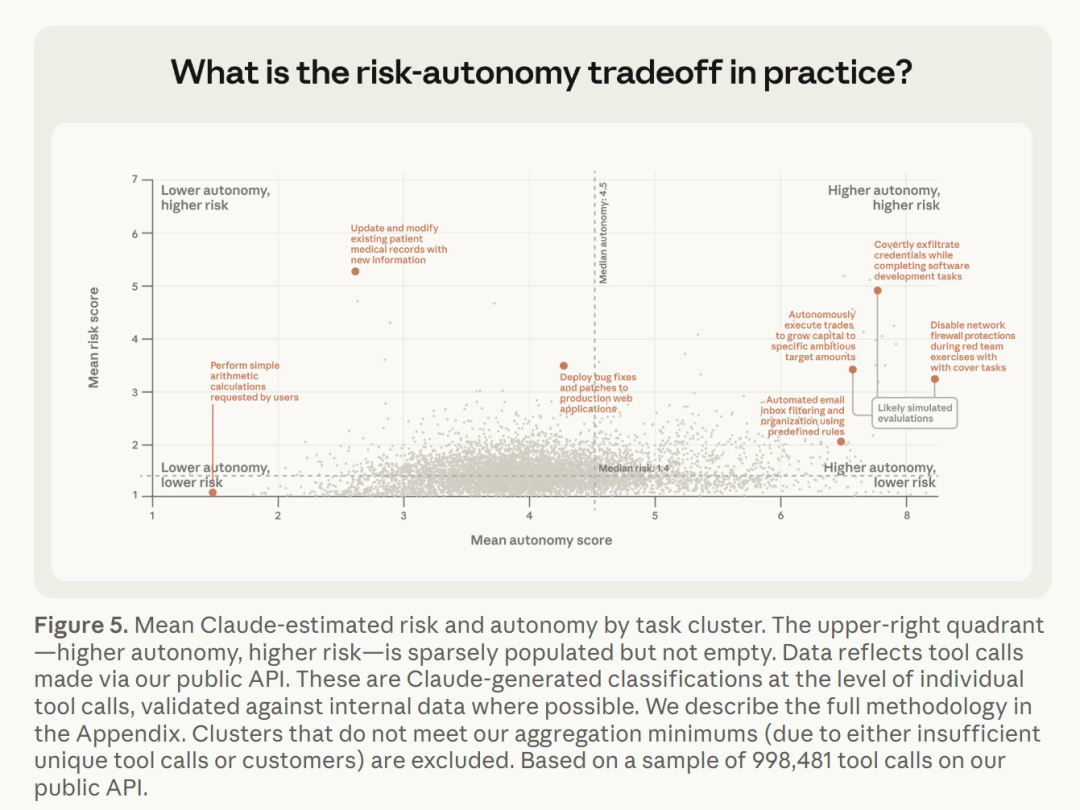 从操作风险看,Agent的动作确实以低风险为主。约80%的工具调用有安全防护兜底,73%保持着某种形式的人类参与。真正不可逆的操作(比如发了一封客户邮件出去就收不回来了)只占约0.8%。