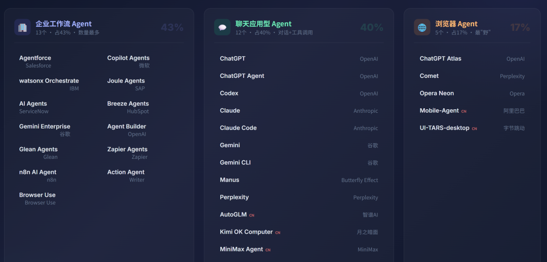 中国产品上榜5个——Kimi、MiniMax、Z.ai、Alibaba MobileAgent、ByteDance TARS。Manus注册在开曼群岛,但团队和产品来自中国。如果算上,国产占比20%。