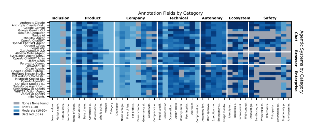 30个Agent里,只有4个披露了Agent专属的system card(系统说明文档,详细说明自主度、行为边界、风险分析)——分别是ChatGPT Agent、OpenAI Codex、Claude Code和Gemini 2.5 Computer Use。
