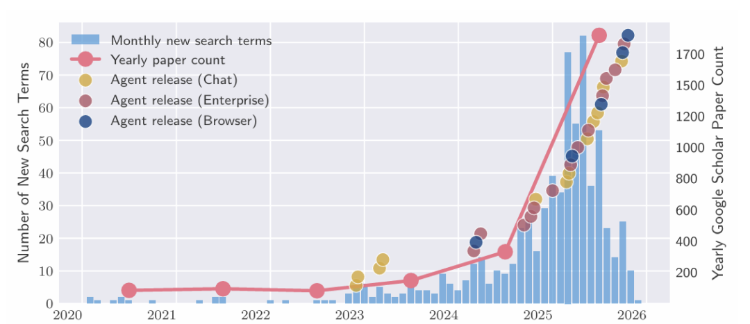 粉色折线——Google Scholar上每年关于Agent的论文数量。从2024年开始陡峭上升,到2025-2026年已接近每年1800篇。。
