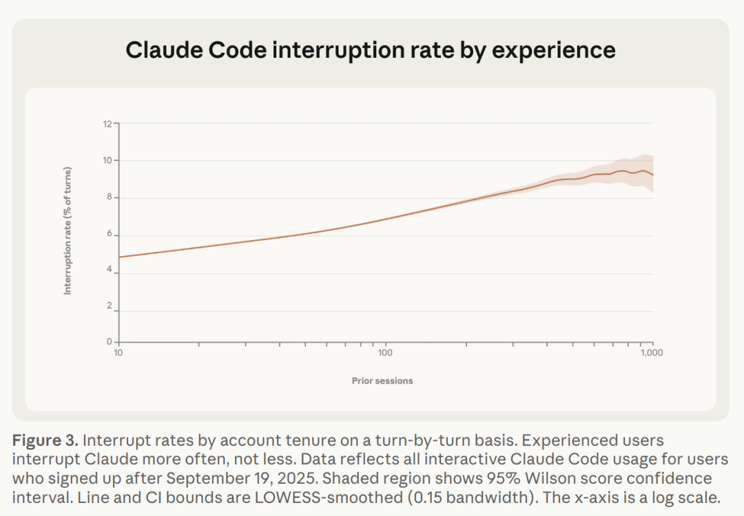 老用户(超过750次会话):超过40%开全自动批准,信任确实涨了。但打断率也涨到了约9%,反而比新用户高一倍。
