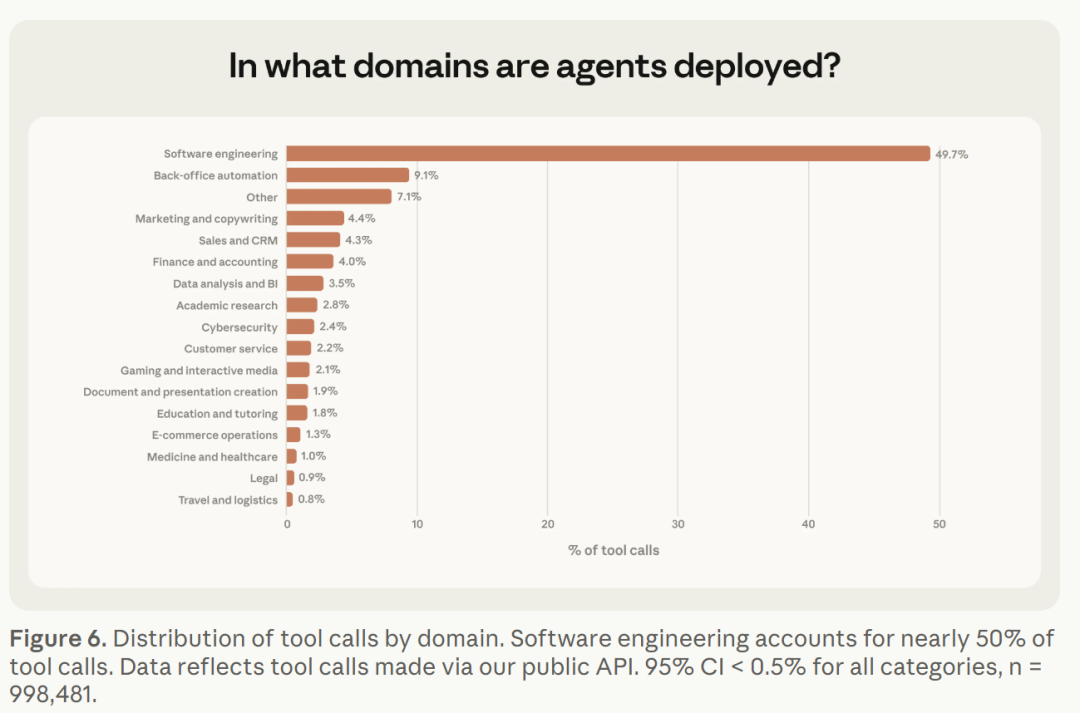 Anthropic这篇看的是内部——Agent在真实使用中实际怎么跑的。编程占了接近50%,其他领域各只有几个百分点。