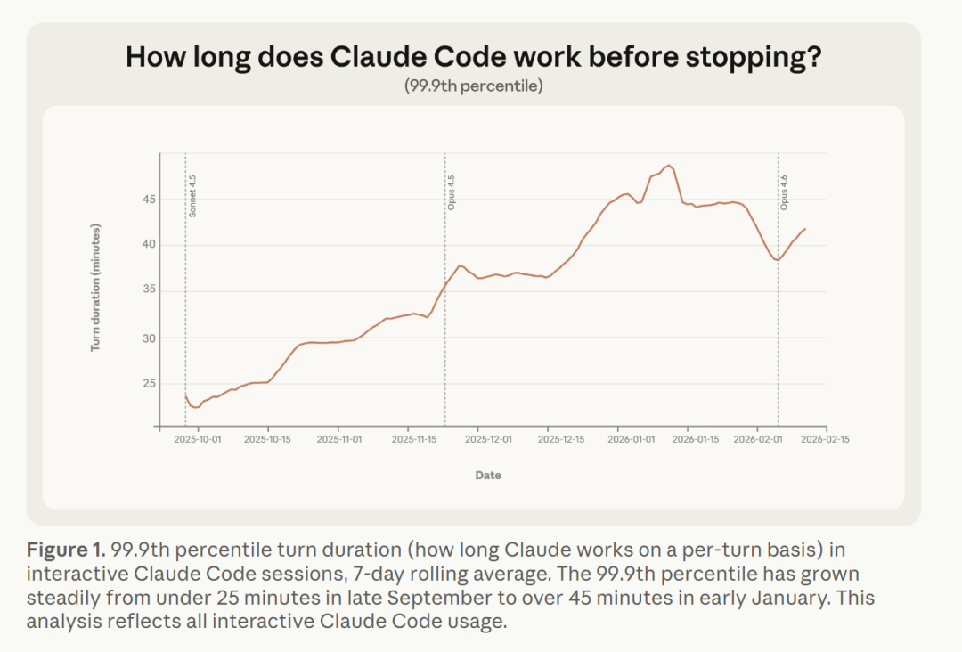 2025年10月到2026年1月,Claude Code最长任务的不中断运行时长从不到25分钟涨到了超过45分钟,三个月内近乎翻倍。